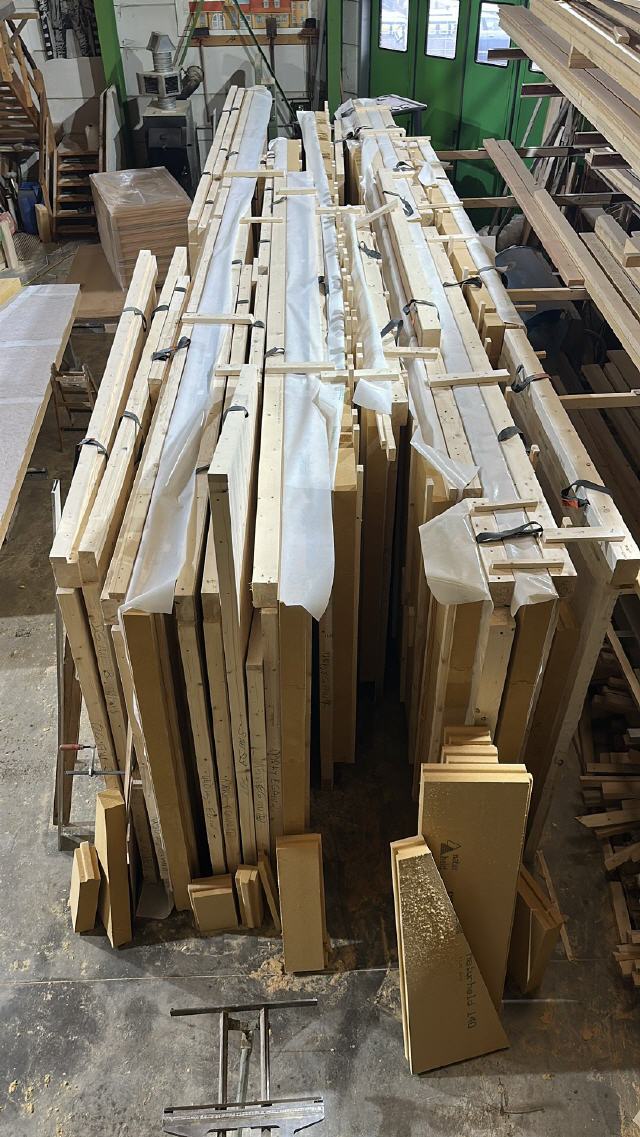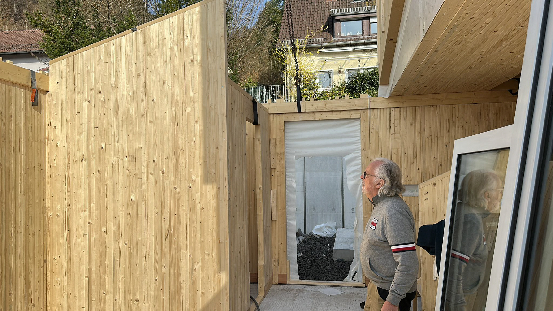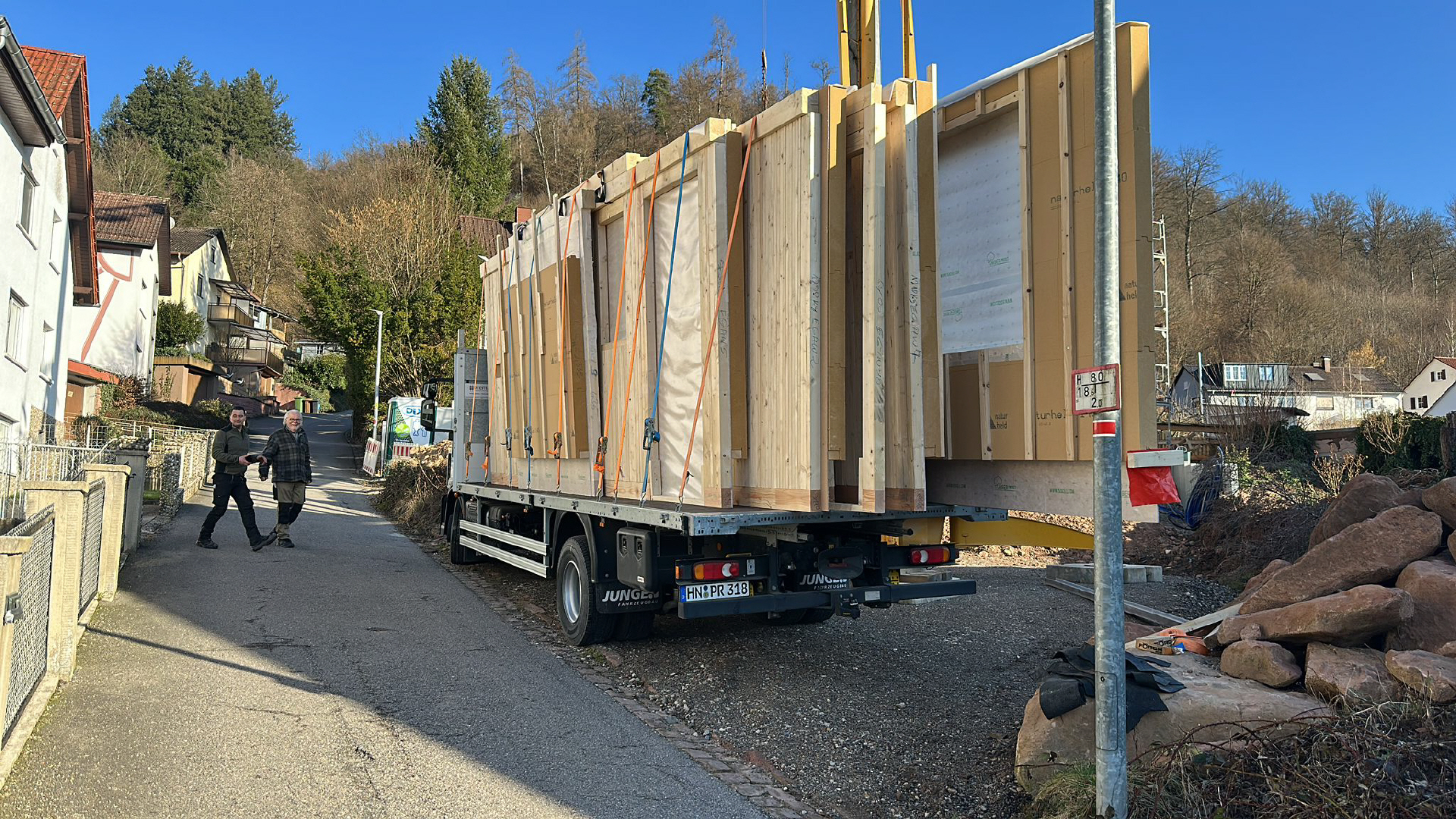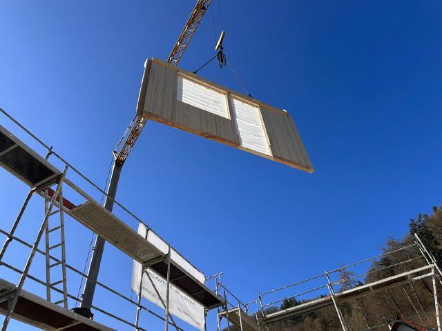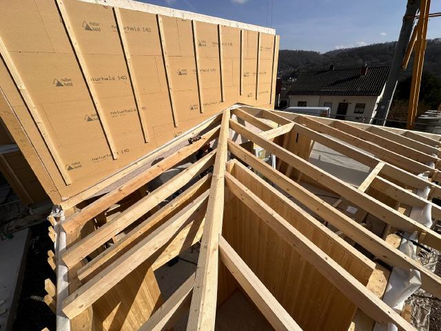 die Holzwände stehen komplett fertig mit Außendämmung und Unterkonstruktion für die Fassade in der Zimmerei und warten auf den Transport.
