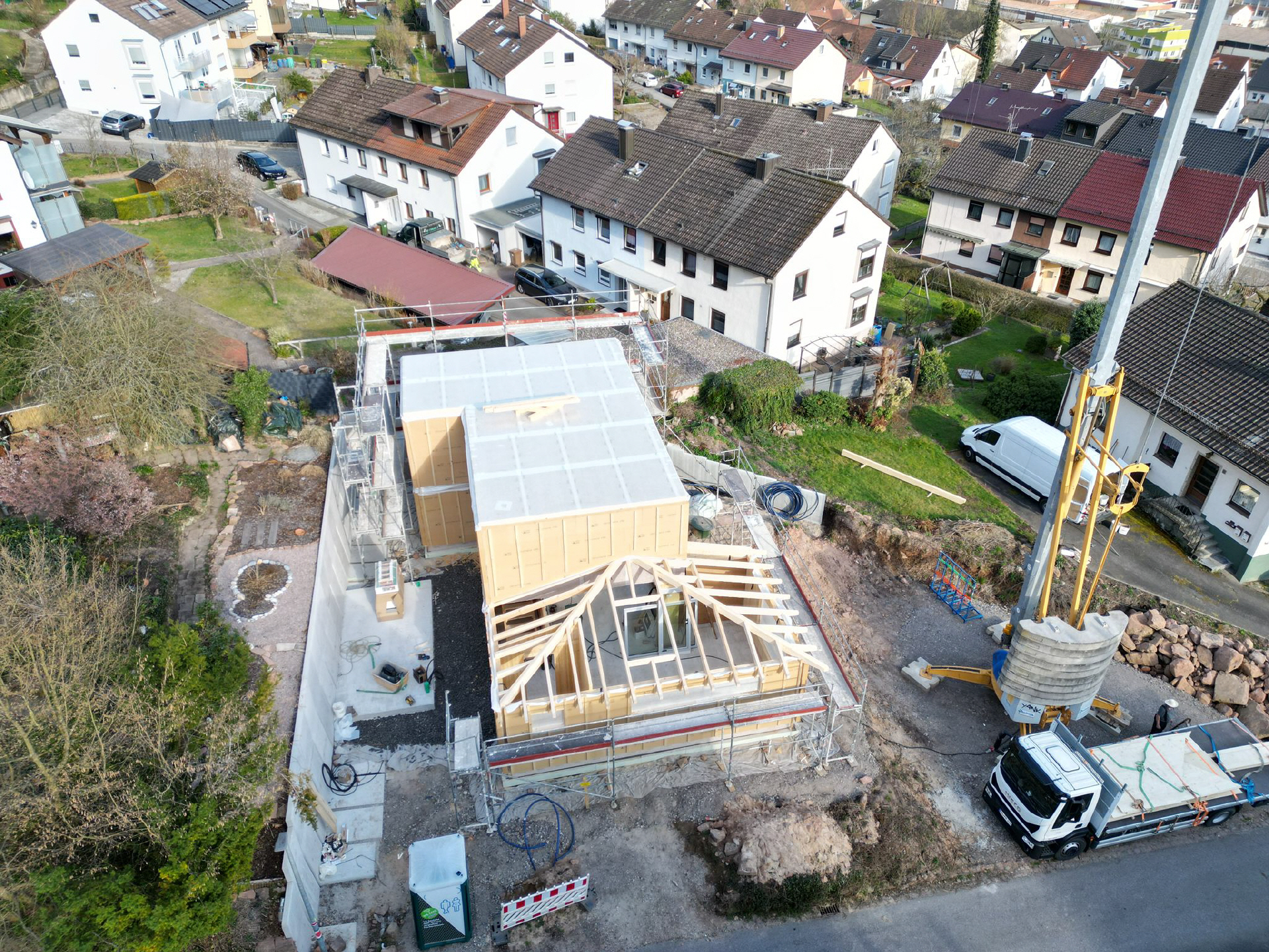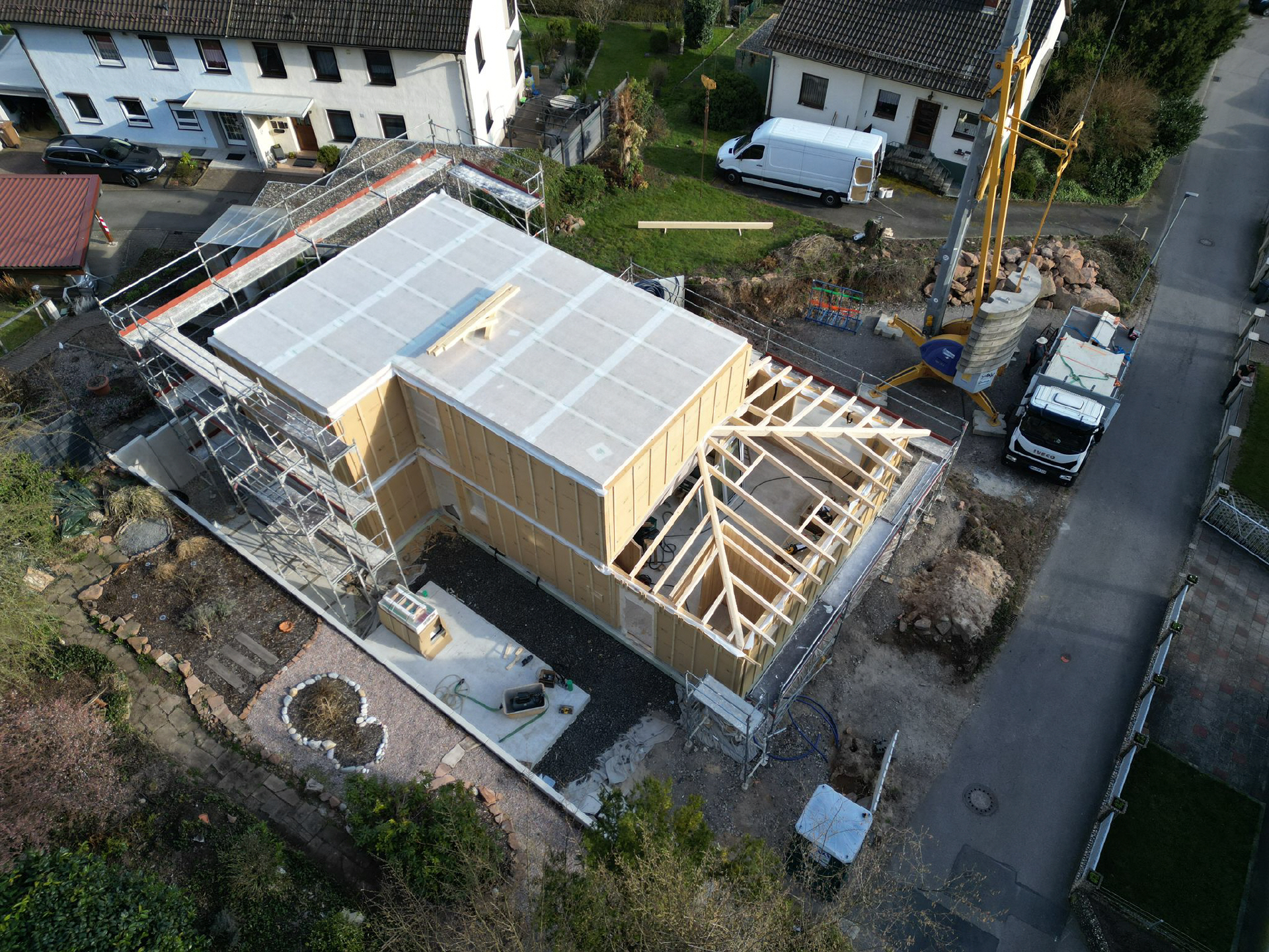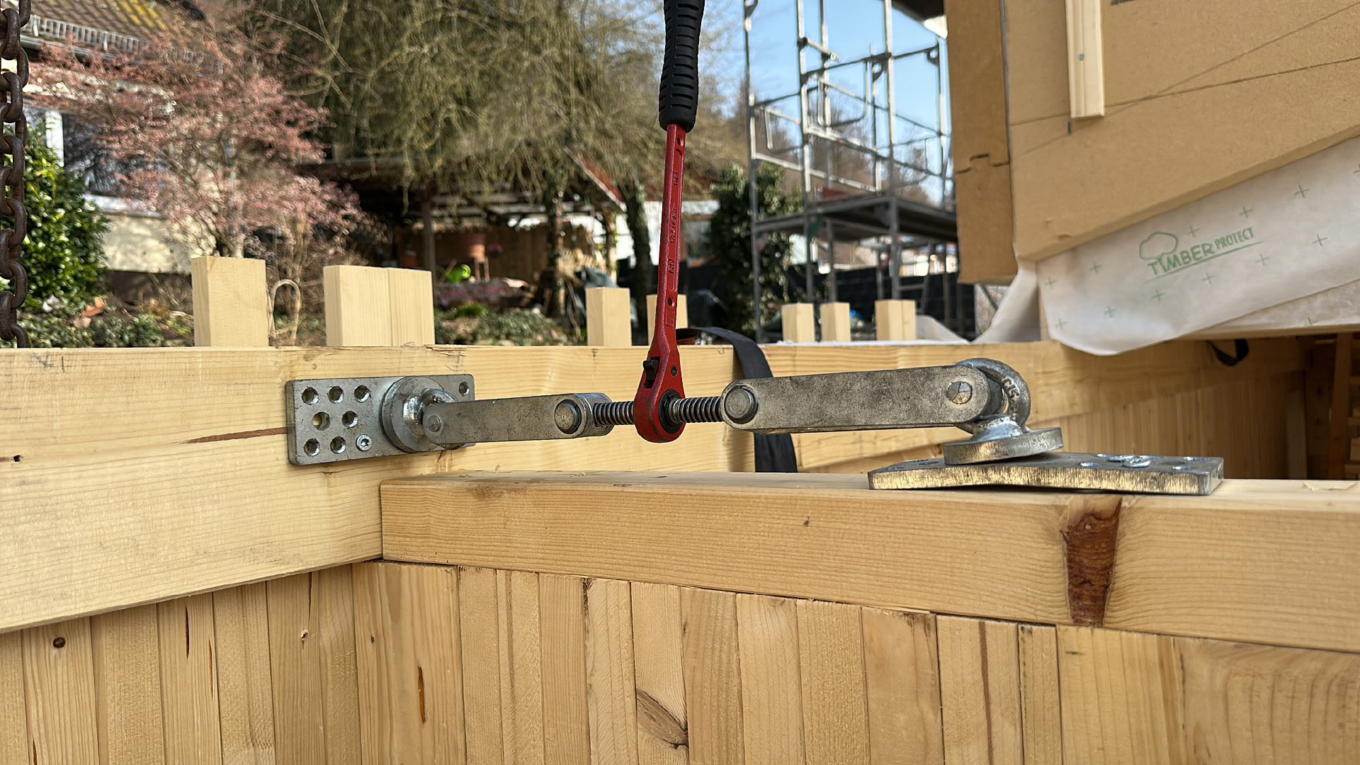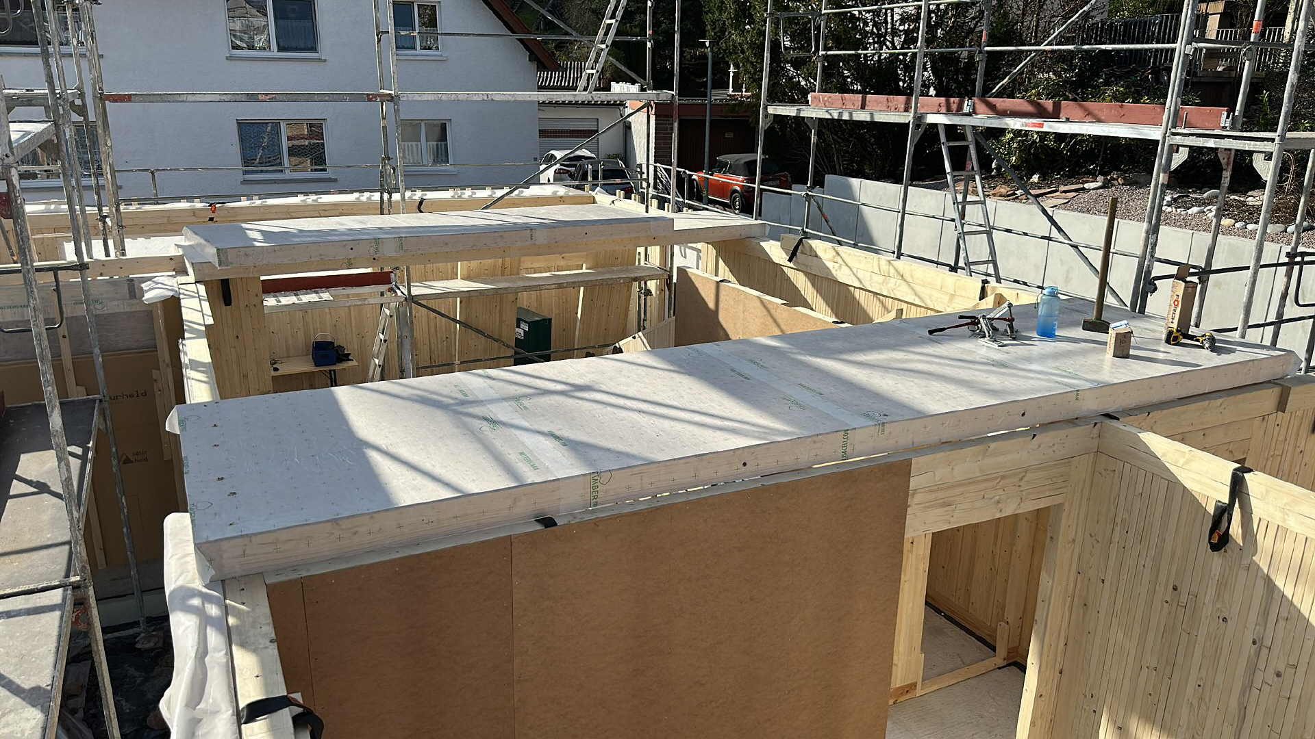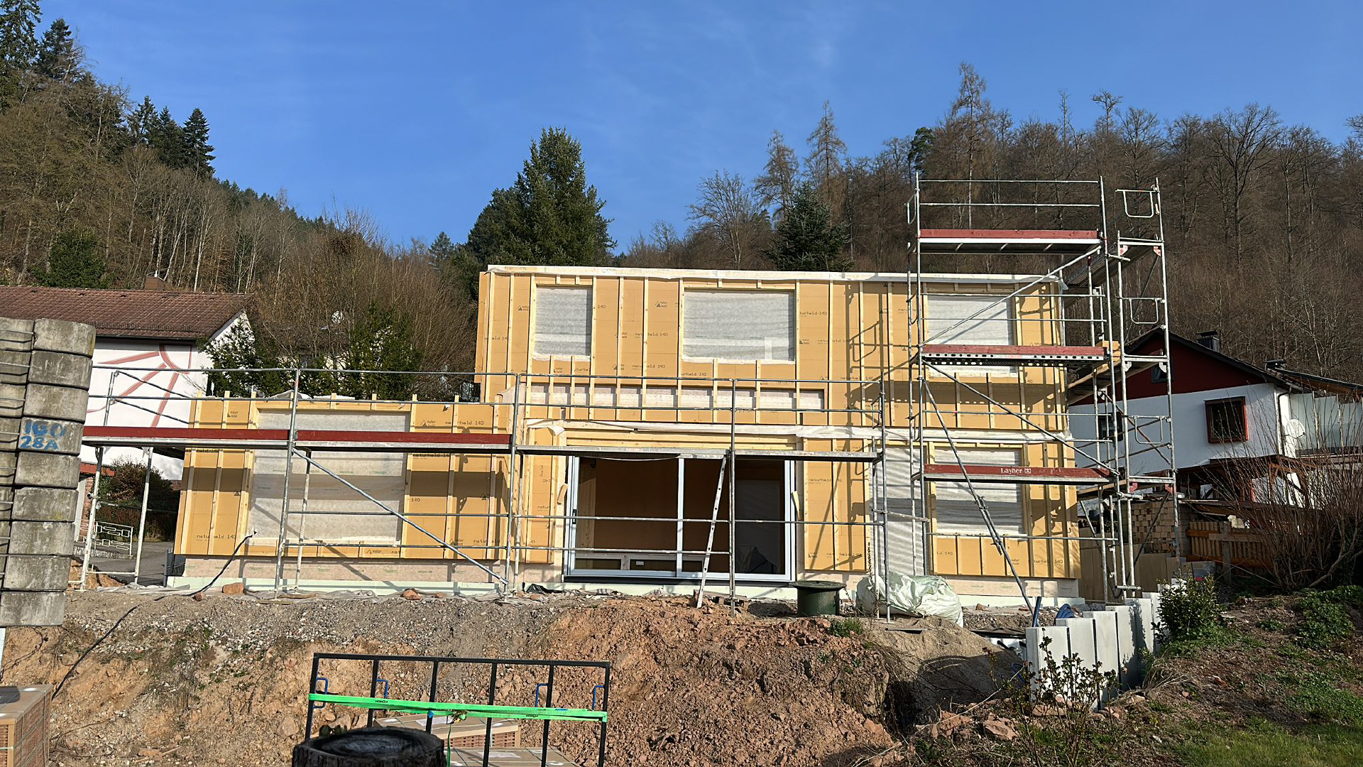 in Anbetracht der guten Wetteraussichten haben wir das Gerüst gestellt, damit wir für den Aufbau der Holzwände vorbereitet sind.